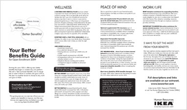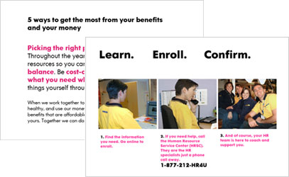 Delighted with the quick turnaround, our strong grasp of the company culture, and the counsel we provided on building a health care consumer mindset, the company engaged context to create their 2009 benefits guide. Operating under an even tighter time frame, this one-page electronic communication was developed within three days and went straight to layout. The communication drew high praise. Eighty-nine percent of employee respondents said the materials were helpful in understanding and choosing their benefits. Messaging from this piece was also incorporated into manager and employee training materials.