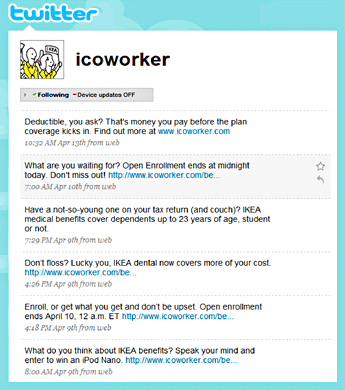 True to their innovative nature, the client jumped at the chance to use Twitter when context and a colleague, Benz Communications, suggested that the micro-blogging platform was the perfect communication channel for reaching employees—and more important, the family members who drive a large portion of the retailer's health care costs. Working together, the client, context, and Benz Communications developed a Twitter strategy that initially communicated annual enrollment information and expanded to now include broader human resources topics.